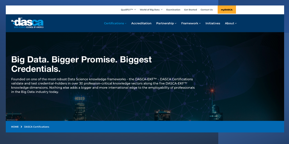 10. Data Science Professional Certification from the Data Science Council of America (DASCA): This certification validates your competence to deal with big data and analytics technologies and approaches.